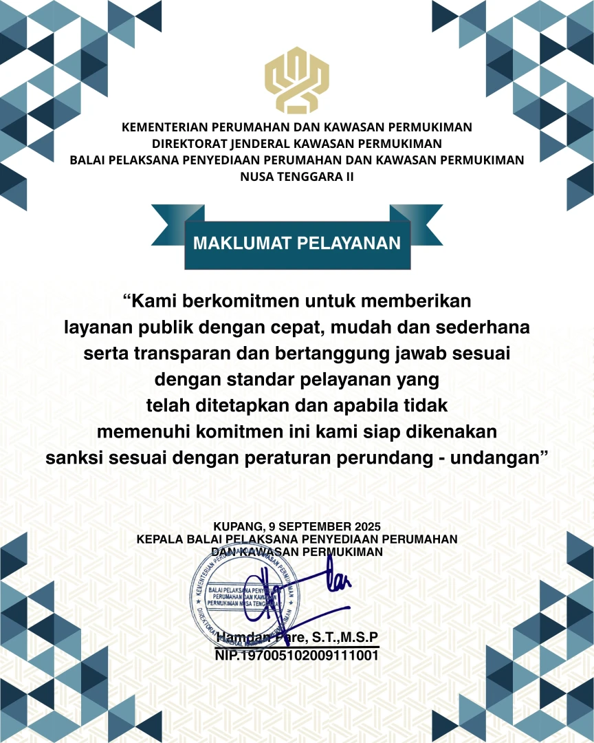 Balai Pelaksana Penyediaan Perumahan & Kawasan Permukiman Melakukan Penandatanganan Maklumat Pelayanan yang di tanda tangani oleh Kepala Balai P3KP Nusa Tenggara II, Bapak Hamdan Pare, S.T.,M.S.P. Dengan adanya Maklumat Pelayanan diharapkan Pelayanan pada Balai P3KP Nusa Tenggara II menjadi cepat, mudah, sederhana, transparan, dan bertanggung jawab.