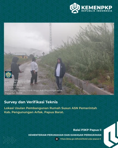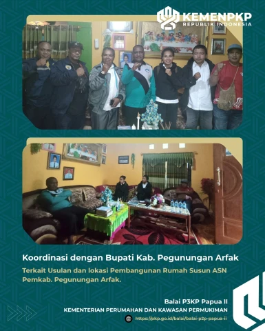 Selain melakukan Monitoring, Tim BP3KP Papua II yang didampingi oleh Dinas PKP dan Lingkungan Hidup Kabupaten Pegunungan Arfak Fince Ferdinanda Baransano, sekaligus melakukan Survey dan Verifikasi teknis Lokasi Usulan Pembangunan Rumah Susun ASN Pemerintah Kab. Pengunungan Arfak. Selanjutnya tim bergerak ke Rumah Bupati Kabupaten Pegunungan Arfak untuk berkoordinasi terkait usulan pembangunan rumah susun.