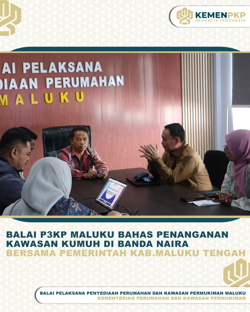 Balai Pelaksana Penyediaan Perumahan dan Kawasan Permukiman Maluku (BP3KP) bersama Pemerintah Kabupaten Maluku Tengah melaksanakan agenda pertemuan guna membahas penanganan kawasan kumuh di Banda Naira Kabupaten Maluku Tengah, yang berlangsung di ruang rapat kantor BalaI P3KP Maluku, Selasa (17/06/2025).