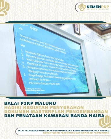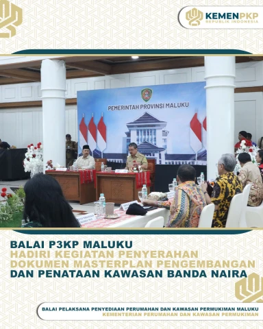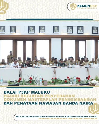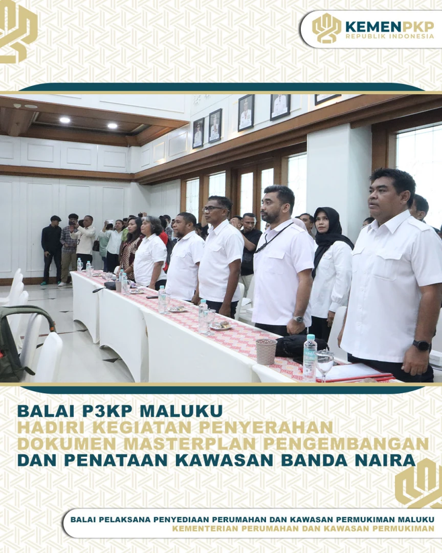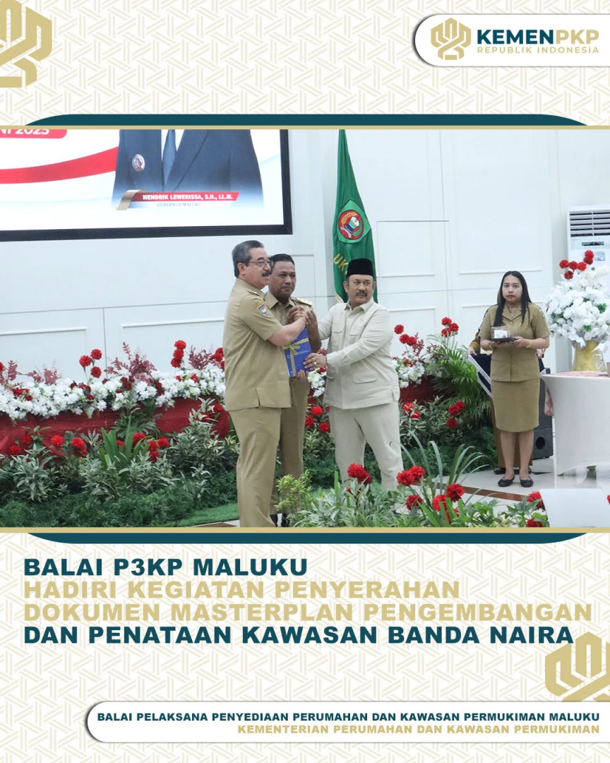 Balai Pelaksana Penyediaan Perumahan dan Kawasan Permukiman Maluku yang diwakili oleh Kepala Subbagian Umum dan Tata Usaha ibu Yunita Pelu, S.E.,M.M bersama Kepala Seksi Pelaksanaan Wilayah I bapak Refi Latuamury, S.T dan Kepala Seksi Pelaksanaan Wilayah II ibu Emilia R. Hamid, S.T menghadiri kegiatan Penyerahan Dokumen Masterplan Pengembangan dan Penataan Kawasan Banda Naira yang diselenggarakan oleh Pemerintah Provinsi Maluku bersama Kementerian Perencanaan Pembangunan Nasional/Badan Perencanaan Pembangunan Nasional Republik Indonesia yang berlangsung di kantor Gubernur Maluku, (Senin 16 Juni 2025).