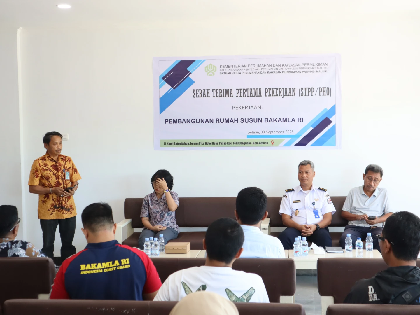 Ambon,Kompu - Balai Pelaksana Penyediaan Perumahan dan Kawasan Permukiman (BP3KP) Maluku secara resmi menerima hasil pekerjaan pembangunan Rumah Susun Bakamla Zona Timur kepada Badan Keamanan Laut (Bakamla) Zona Timur Republik Indonesia. Serah terima pekerjaan atau Provisional Hand Over (PHO) ini dilaksanakan di Ambon, dengan dilakukannya penandatanganan Berita Acara Serah Terima Pertama Pekerjaan antara Pejabat Pembuat Komitmen (PPK) Rumah Susun dan pihak pelaksana konstruksi yaitu Fa. Forum Swadharma, Selasa (30/9/2025).