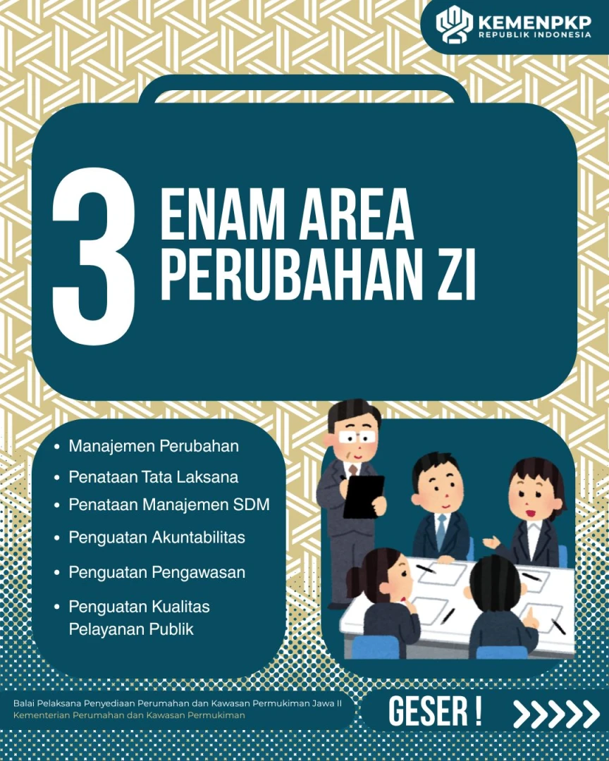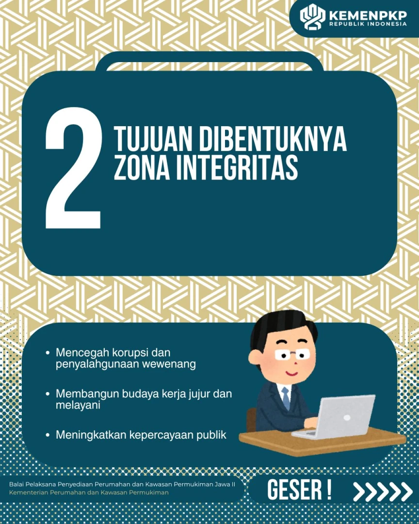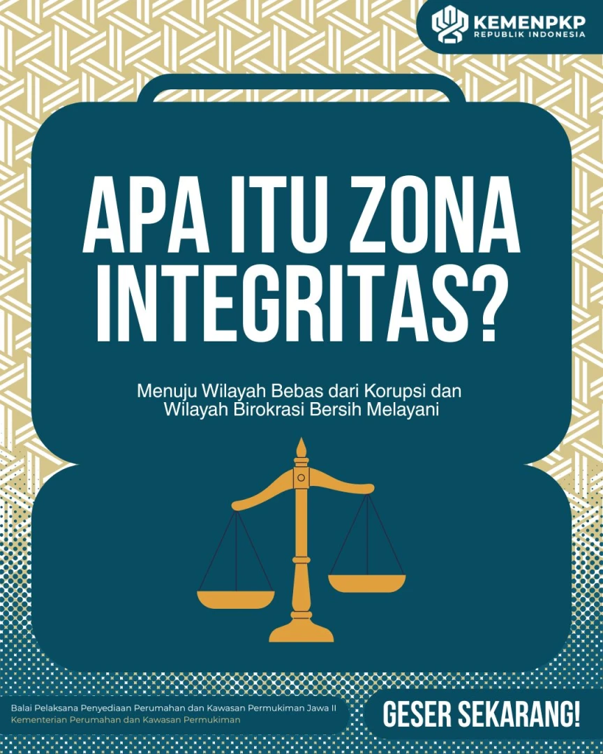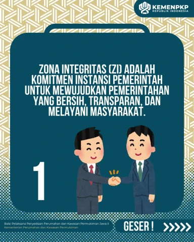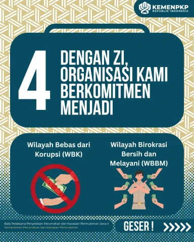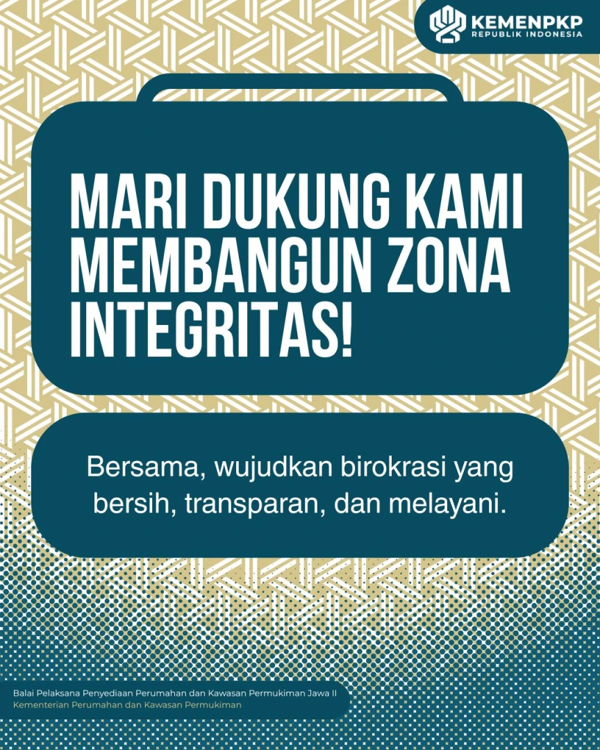 Balai Pelaksana Penyediaan Perumahan dan Kawasan Permukiman (BP3KP) Jawa II berkomitmen penuh mewujudkan Zona Integritas (ZI) sebagai langkah nyata untuk menghadirkan pemerintahan yang bersih, transparan, akuntabel, serta memberikan pelayanan terbaik kepada masyarakat; melalui penguatan enam area perubahan dan tekad menuju Wilayah Bebas dari Korupsi (WBK) serta Wilayah Birokrasi Bersih dan Melayani (WBBM), kami terus membangun budaya kerja yang jujur, berintegritas, dan melayani, dan untuk tahu lebih lanjut mengenai ZI dapat dilihat pada slide berikut ini.