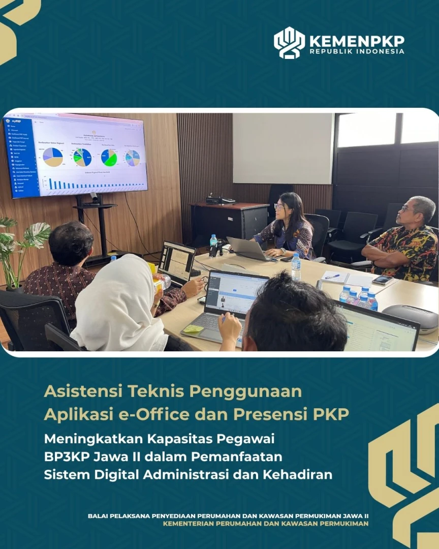 Balai Pelaksana Penyediaan Perumahan dan Kawasan Permukiman (BP3KP) Jawa II menyelenggarakan Asistensi Teknis Penggunaan Aplikasi e-Office dan Presensi PKP yang bertempat di Kantor BP3KP Jawa II, Jl. Lengkong Besar No. 10, Kota Bandung, dan diikuti oleh seluruh pegawai terkait di lingkungan BP3KP Jawa II (15/07/25).