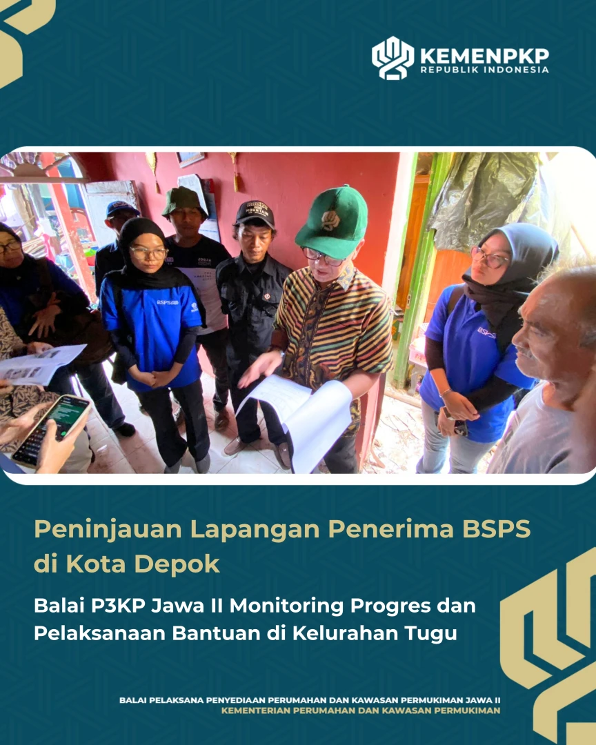 Balai Pelaksana Penyediaan Perumahan dan Kawasan Permukiman (BP3KP) Jawa II melaksanakan kegiatan tinjauan lapangan kepada penerima Bantuan Stimulan Perumahan Swadaya (BSPS) di Kelurahan Tugu, Kecamatan Cimanggis, Kota Depok, pada Selasa (4/11). Kegiatan ini dihadiri oleh Kepala Balai P3KP Jawa II, Satuan Kerja PKP Provinsi Jawa Barat, Koordinator Kota Depok, serta Tenaga Fasilitator Lapangan (TFL). Dari total 12 unit rumah yang mendapatkan alokasi BSPS, hasil peninjauan menunjukkan bahwa sebagian besar penerima telah menerima material bantuan dan mulai melakukan perbaikan rumah dengan dukungan swadaya masyarakat.
