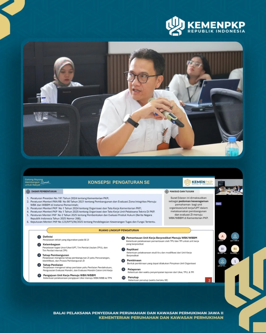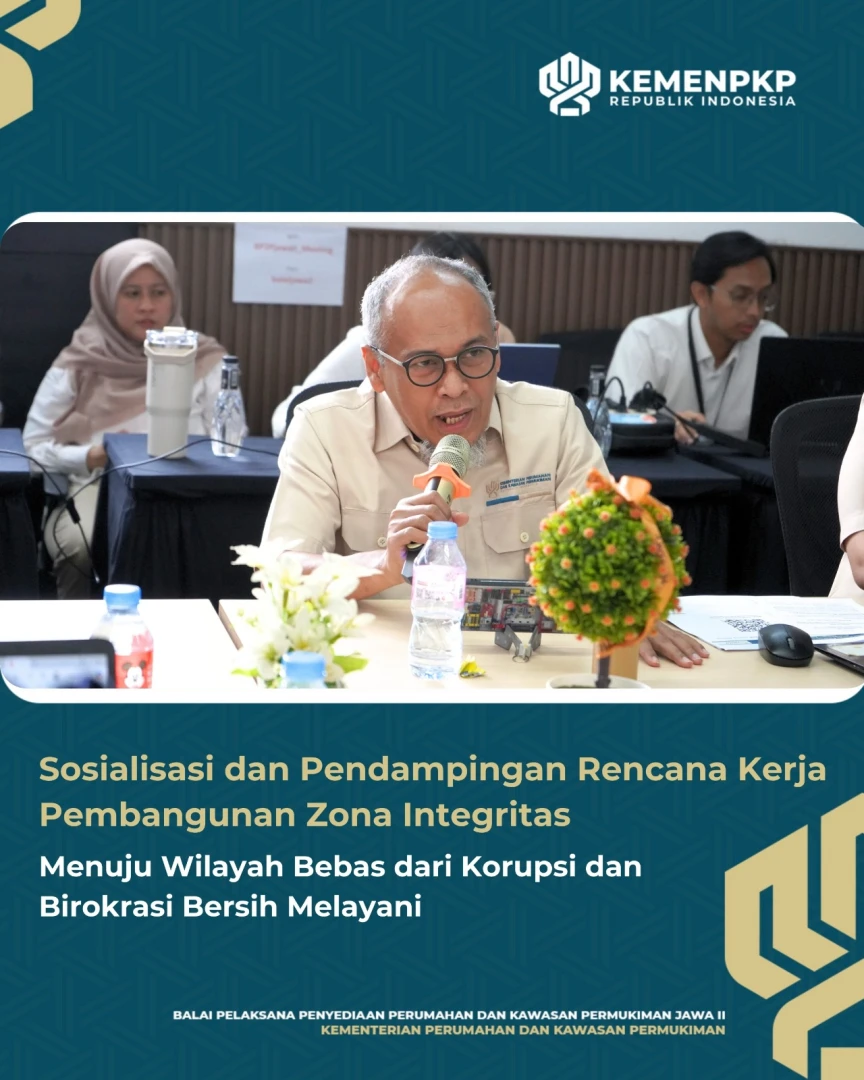 Balai Pelaksana Penyediaan Perumahan dan Kawasan Permukiman (BP3KP) Jawa II menyelenggarakan kegiatan Sosialisasi dan Pendampingan Penyusunan Rencana Kerja Pembangunan Zona Integritas (ZI) di Ruang Rapat BP3KP Jawa II Rabu (17/09). Kegiatan ini diikuti oleh Tim Pokja ZI dengan tujuan memperkuat pemahaman dan komitmen bersama dalam mewujudkan pembangunan Zona Integritas.