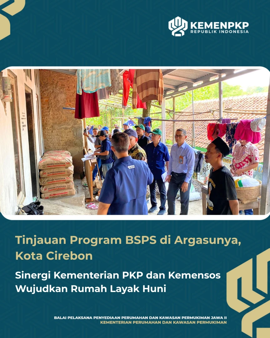 Kementerian Perumahan dan Kawasan Permukiman (PKP) bersama Kementerian Sosial melaksanakan tinjauan lapangan Program Bantuan Stimulan Perumahan Swadaya (BSPS) di Kelurahan Argasunya, Kecamatan Harjamukti, Kota Cirebon, Provinsi Jawa Barat. Kegiatan ini dihadiri oleh Staf Ahli Menteri Sosial Abdul Muis, Direktur Pembangunan Perumahan Perdesaan Teddy Paul H. Siagian, Kepala Balai P3KP Jawa II Mulya, Kasatker PKP Provinsi Jawa Barat Praditya, serta PPK Swadaya Nadya. Dalam kunjungan tersebut, tim meninjau langsung rumah penerima bantuan, di antaranya rumah yang dihuni enam orang dengan kondisi atap bocor selain itu salah satu anak penghuni rumah tersebut, tercatat sebagai siswa Sekolah Rakyat (SR) dan menjadi prioritas penerima bantuan hasil kolaborasi antara Kemensos dan Baznas. Program ini merupakan bagian dari upaya pengentasan kemiskinan terintegrasi yang menggabungkan bantuan sosial, MBG, serta mendukung Program 3 Juta Rumah.