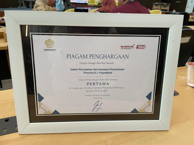Satker Perumahan dan Kawasan Permukiman DI Yogyakarta memperoleh penghargaan IKPA Award terbaik pertama dalam acara Penganugerahan Satuan Kerja dengan Nilai Terbaik di Lingkungan Direktorat Jenderal Perumahan Perkotaan Periode TW III TA 2025.