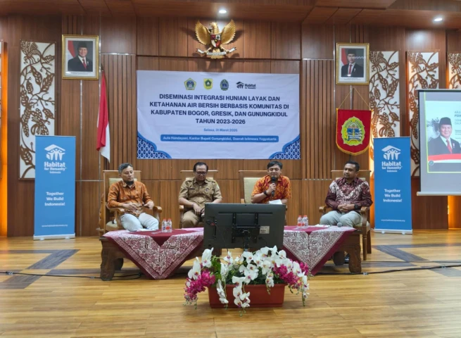 Upaya mewujudkan hunian layak tidak dapat berdiri sendiri. Hal ini menjadi semangat dalam kegiatan Diseminasi Integrasi Hunian Layak dan Ketahanan Air Bersih Berbasis Komunitas yang dilaksanakan pada 31 Maret 2026 di Aula Kantor Bupati Gunungkidul, DIY. Kegiatan ini merupakan inisiasi dari Habitat for Humanity Indonesia dan menghadirkan berbagai pihak untuk berbagi praktik baik dari Kabupaten Bogor, Gresik, dan Gunungkidul dalam mengintegrasikan pembangunan hunian, air bersih, dan sanitasi sebagai satu kesatuan yang saling mendukung.