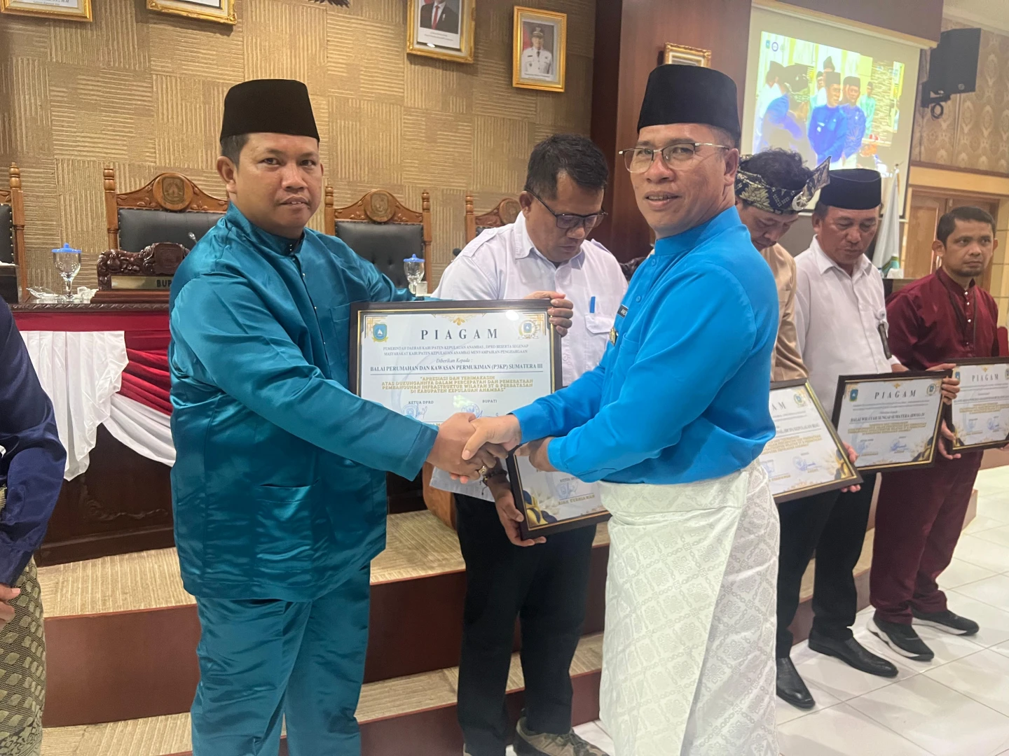 Sebagai bentuk apresiasi, Pemerintah Kabupaten Kepulauan Anambas menyerahkan Piagam Penghargaan kepada perwakilan kementerian/lembaga yang hadir, termasuk Satker PKP Provinsi Kepulauan Riau. Penghargaan ini merupakan simbol terima kasih atas komitmen dan dukungan nyata dalam pemerataan pembangunan di wilayah perbatasan dan terpencil.