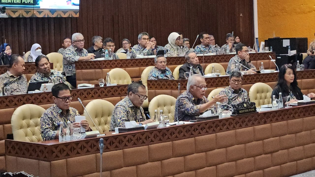 Jakarta - Menteri Pekerjaan Umum dan Perumahan Rakyat (PUPR) bersama sejumlah Pejabat Tinggi Pratama dan Madya mengikuti Rapat Kerja bersama Komisi V DPR RI di Senayan Jakarta, Rabu (18/9/2024). Rapat kerja tersebut membahas penyesuaian Rencana Kerja Anggaran Kementerian/ Lembaga (RKA - K/L) Tahun Anggaran 2025.