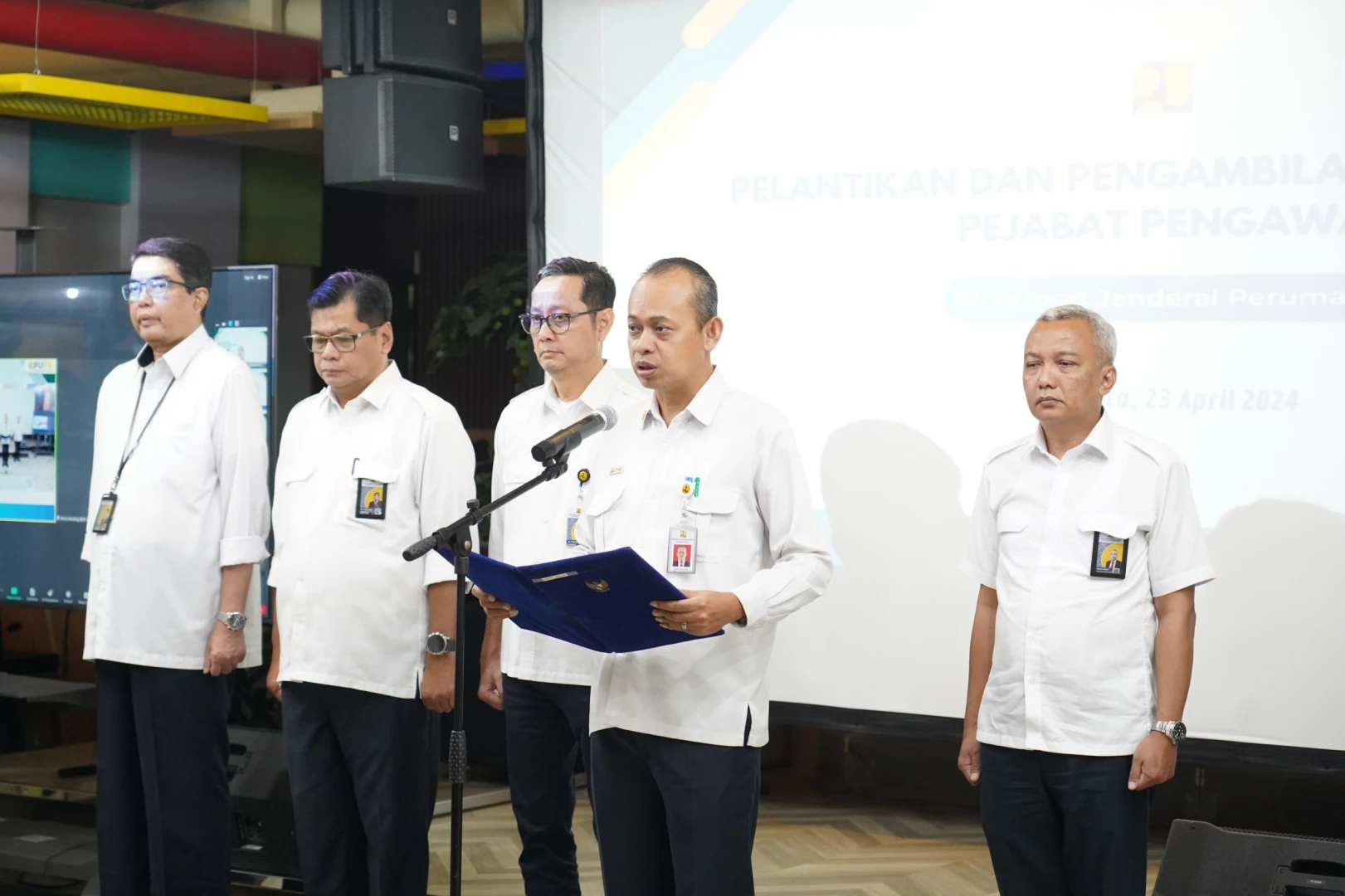Jakarta - Sejumlah pejabat pengawas pada unit kerja dan Balai Pelaksana Penyediaan Perumahan (BP2P)di lingkungan Direktorat Jenderal Perumahan dilantik secara resmi oleh Direktur Jenderal Perumahan Kementerian PUPR di Jakarta, Selasa (23/4/2024). Para pejabat tersebut diharapkan mampu melaksanakan kepercayaan dan amanah dengan baik dan penuh tanggung jawab serta memiliki kompetensi yang mampu menjabarkan visi dan misi organisasi ke dalam kegiatan di lingkup unit kerja.