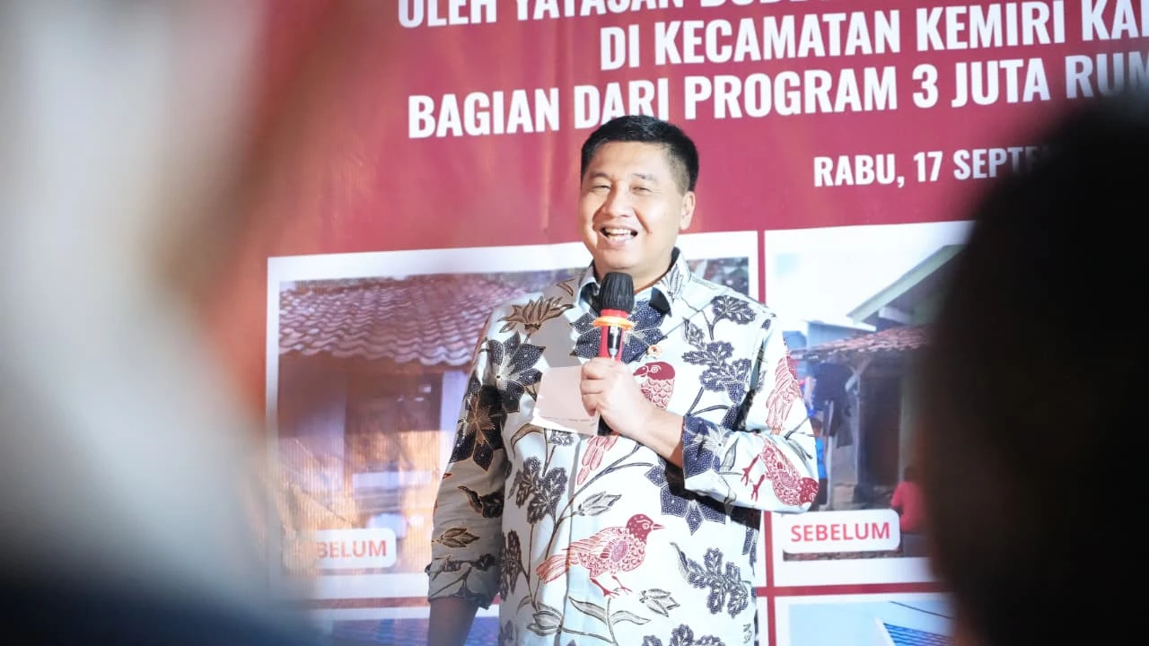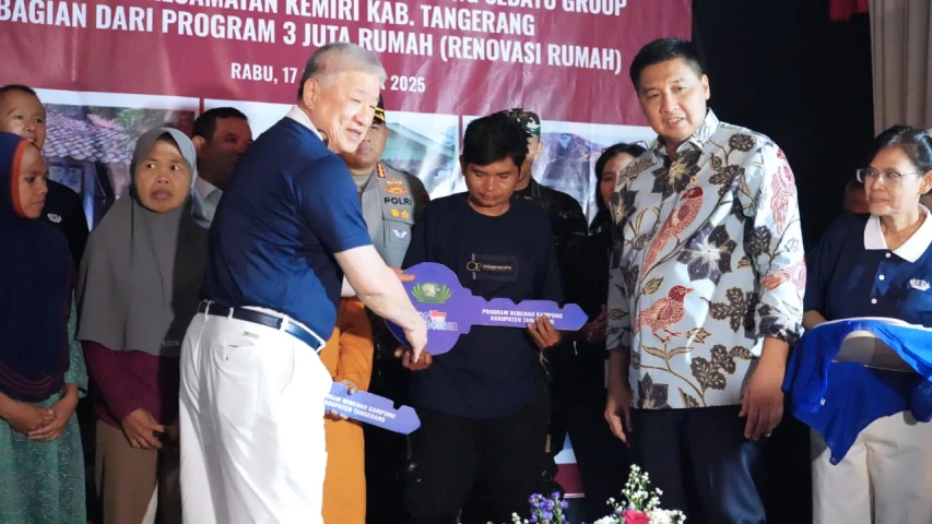 Menteri Perumahan dan Kawasan Permukiman (PKP) Maruarar Sirait (Ara) bersama Plt. Sekretaris Utama BPS Moh Edy Mahmud, Bupati Tangerang Moch. Maesyal Rasyid, Pimpinan Yayasan Budha Suci Indonesia sekaligus Pimpinan Agung Sedayu Grup Sugianto Kusuma (Aguan) menghadiri Serah Terima Kunci sebanyak 115 unit rumah dari Program Gotong Royong Renovasi Rumah Merah Putih oleh Yayasan Buddha Tzu Chi dan Agung Sedayu Grup di Kecamatan Kemiri Kabupaten Tangerang, Rabu (17/9/2025).