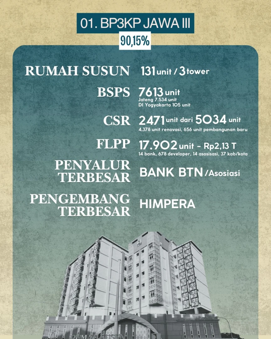 Sekretaris Jenderal Kementerian PKP Didyk Choiroel mengungkapkan, dari seluruh balai pelaksana, BP3KP Jawa III (meliputi Provinsi Jawa Tengah dan DI Yogyakarta) mencatat capaian tertinggi dengan realisasi keuangan 90,15 persen. Wilayah ini berhasil membangun 131 unit rumah susun (3 tower), 7.639 unit rumah swadaya (BSPS), serta 2.471 unit rumah CSR yang telah selesai dari 5.034 unit yang direncanakan. Program FLPP di wilayah ini juga mencatat penyaluran 17.902 unit rumah senilai Rp2,13 triliun, didukung oleh 14 bank dan 678 pengembang yang tergabung dalam 14 asosiasi, dengan HIMPERRA sebagai asosiasi terbesar.