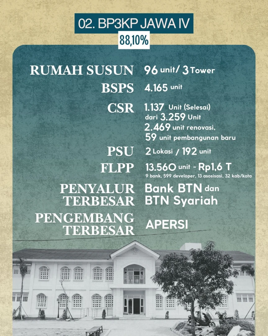 Sekjen Didyk melanjutkan, posisi kedua ditempati BP3KP Jawa IV (Provinsi Jawa Timur) dengan realisasi 88,10 persen, mencakup 96 unit rumah susun (3 tower), 4.165 unit BSPS, dan 1.137 unit rumah CSR dari 3.259 unit yang direncanakan. Penyaluran FLPP di wilayah ini mencapai 13.560 unit rumah senilai Rp1,6 triliun, dengan dukungan berbagai mitra CSR seperti BAZNAS, Kwarda Pramuka, Buddha Tzu Chi, Lippo Group, dan Ciputra, serta APERSI sebagai asosiasi pengembang terbesar.