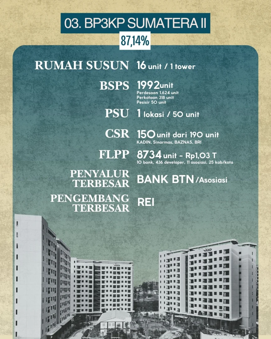 Sementara itu, BP3KP Sumatera II (Provinsi Sumatera Utara) menempati posisi ketiga dengan realisasi 87,14 persen. Capaian ini meliputi pembangunan 16 unit rumah susun (1 tower), 1.992 unit BSPS, dan 150 unit rumah CSR yang telah selesai dari 199 unit yang direncanakan. Program FLPP di wilayah ini menyalurkan 8.734 unit rumah senilai Rp1,03 triliun, didukung oleh mitra CSR seperti KADIN, Sinarmas, BAZNAS, dan BRI.