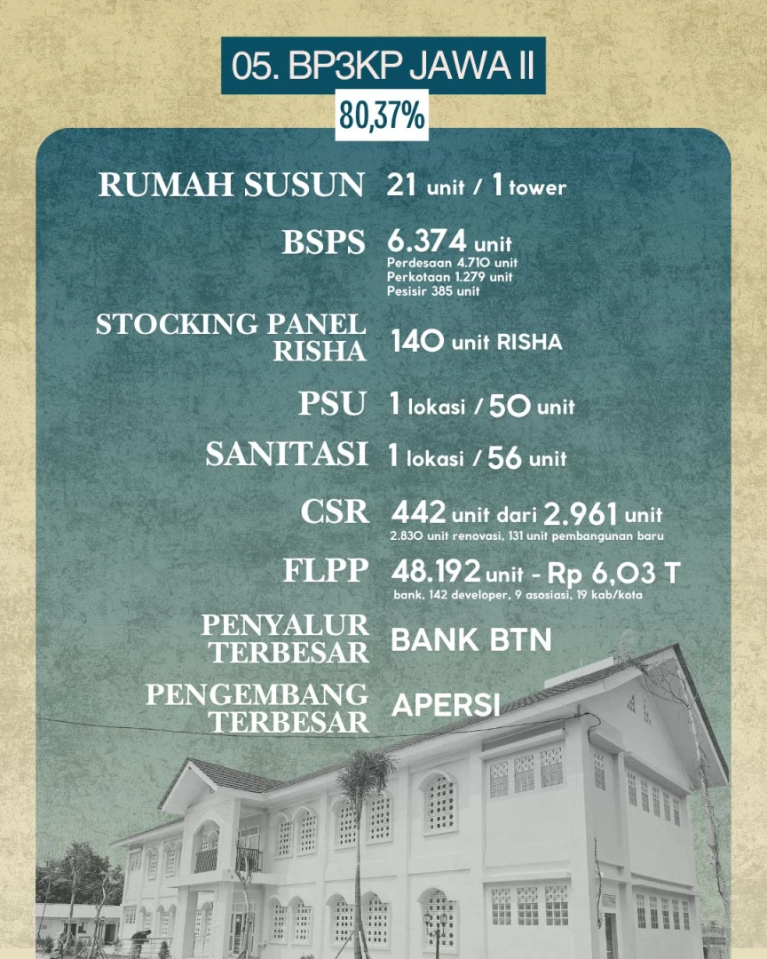 Adapun BP3KP Jawa II (Provinsi Jawa Barat) berada di posisi kelima dengan realisasi 80,37 persen. Wilayah ini memiliki cakupan program paling luas, mencakup 21 unit rumah susun (1 tower), 6.374 unit BSPS, 6 lokasi PSU dengan 444 unit, serta penanganan kawasan kumuh seluas 29,03 hektare. Program FLPP Jawa Barat mencatat realisasi tertinggi nasional dengan 48.192 unit rumah senilai Rp6,03 triliun. Dukungan CSR datang dari PT Astra, Buddha Tzu Chi, Perum Peruri, Yayasan Sehati, Pupuk Kujang Cikampek, BAZNAS, dan Islamic Relief Indonesia.