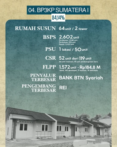 Di posisi keempat, BP3KP Sumatera I (Provinsi Aceh) mencatat realisasi 84,14 persen, dengan capaian 64 unit rumah susun (2 tower), 2.602 unit BSPS, serta 52 unit rumah CSR yang telah rampung dari 119 unit yang direncanakan. Program FLPP di wilayah ini mencapai 1.572 unit rumah senilai Rp184,8 miliar.
