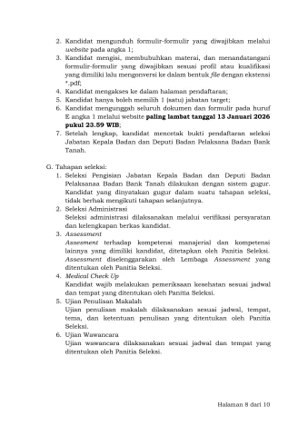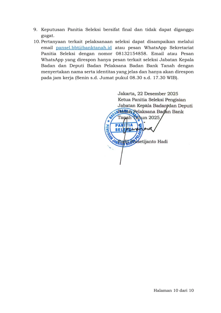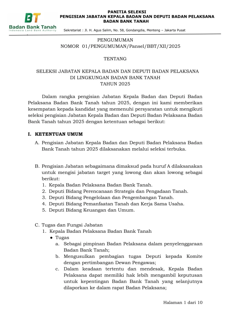 Jakarta — Panitia Seleksi Pengisian Jabatan Kepala Badan dan Deputi Badan Pelaksana Badan Bank Tanah secara resmi membuka seleksi terbuka untuk pengisian jabatan strategis di lingkungan Badan Bank Tanah Tahun 2025. Seleksi ini dilaksanakan sebagai bagian dari upaya penguatan tata kelola kelembagaan serta peningkatan profesionalisme dalam pengelolaan tanah negara untuk sebesar-besarnya kemakmuran rakyat.
