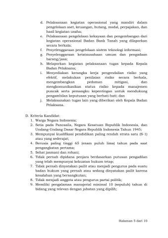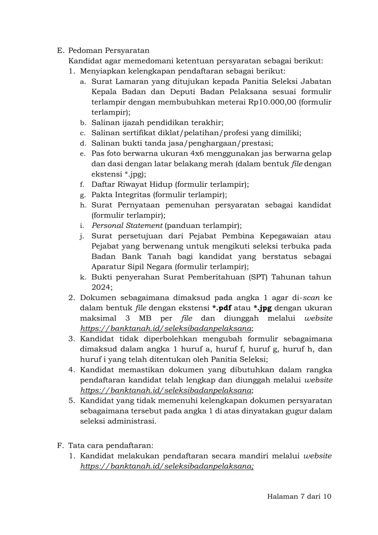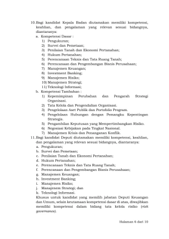 Panitia Seleksi membuka kesempatan seluas-luasnya bagi Warga Negara Indonesia yang memenuhi persyaratan untuk mengikuti proses seleksi. Kandidat diharapkan memiliki integritas, kompetensi, serta pengalaman manajerial yang relevan, dengan penekanan pada kemampuan kepemimpinan, pengelolaan risiko, perencanaan strategis, serta pemahaman di bidang pertanahan dan pengelolaan aset publik.