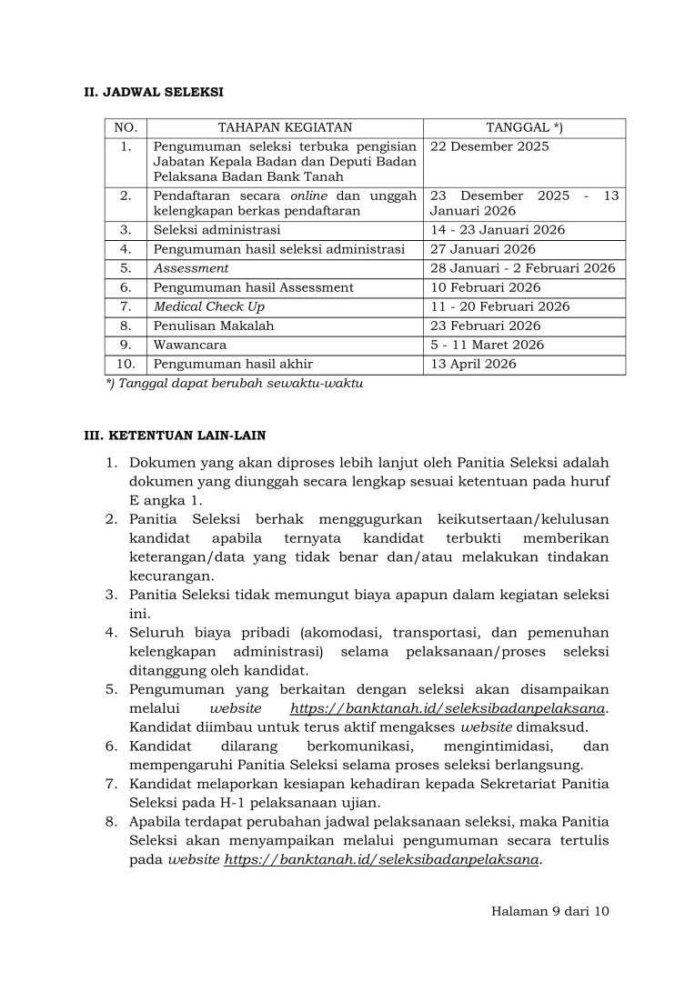 Pendaftaran seleksi dilakukan secara daring melalui laman resmi Badan Bank Tanah https://banktanah.id/seleksibadanpelaksana mulai 23 Desember 2025 hingga 13 Januari 2026. Seluruh informasi resmi terkait tahapan, jadwal, serta hasil seleksi akan diumumkan secara berkala melalui situs tersebut. Panitia Seleksi menegaskan bahwa seluruh proses seleksi tidak dipungut biaya dan mengimbau masyarakat untuk waspada terhadap segala bentuk penipuan yang mengatasnamakan seleksi ini