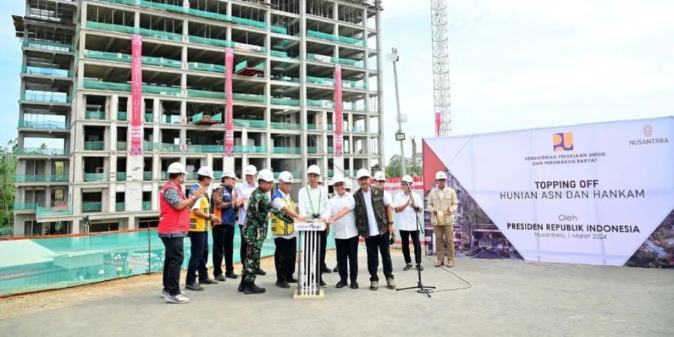 Penajam Paser Utara - Menteri Pekerjaan Umum dan Perumahan Rakyat (PUPR) Basuki Hadimuljono mendampingi Presiden Joko Widodo (Jokowi) melakukan Topping Off Hunian ASN dan Hankam di IKN, Penajam Paser Utara, Kalimantan Timur, Jumat (1/3/2024).