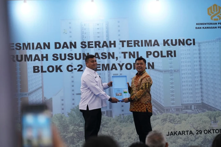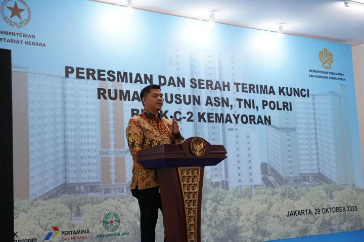 Jakarta - Kementerian Sekretariat Negara (Setneg) bersama Kementerian Perumahan dan Kawasan Permukiman (PKP) menggelar serah terima kunci Rumah Susun bagi Aparatur Sipil Negara (ASN), TNI, Polri di kawasan Wisma Atlet Pademangan, Rabu (29/10/2025). Agenda peresmian dilakukan oleh Wakil Menteri Sekretaris Negara (Wamensesneg) Juri Ardiantoro dan Sekretaris Jenderal Kementerian PKP Didyk Choiroel.