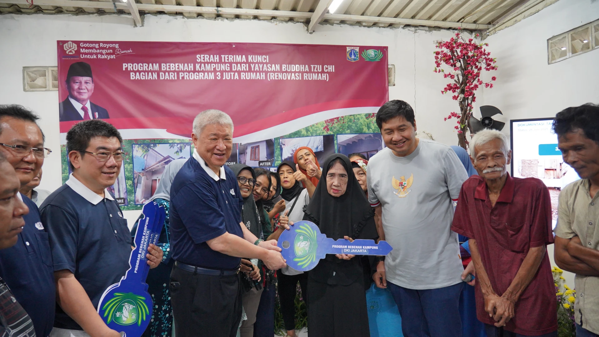 Menteri Perumahan dan Kawasan Permukiman (PKP) Maruarar Sirait didampingi Direktur Jenderal Perumahan Perkotaan Kementerian PKP Sri Haryati dan Wakil Ketua Yayasan Buddha Tzu Chi Indonesia Sugianto Kusuma (Aguan) melakukan serah terima kunci Program Bebenah Kampung Kerja Sama Dengan Yayasan Budha Tzu Chi kepada para penerima bantuan di Kelurahan Tanah Tinggi, Kecamatan Johar Baru, Jakarta Pusat, Sabtu (28/6/2025).