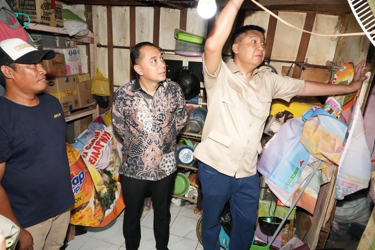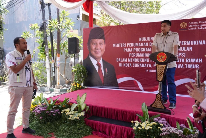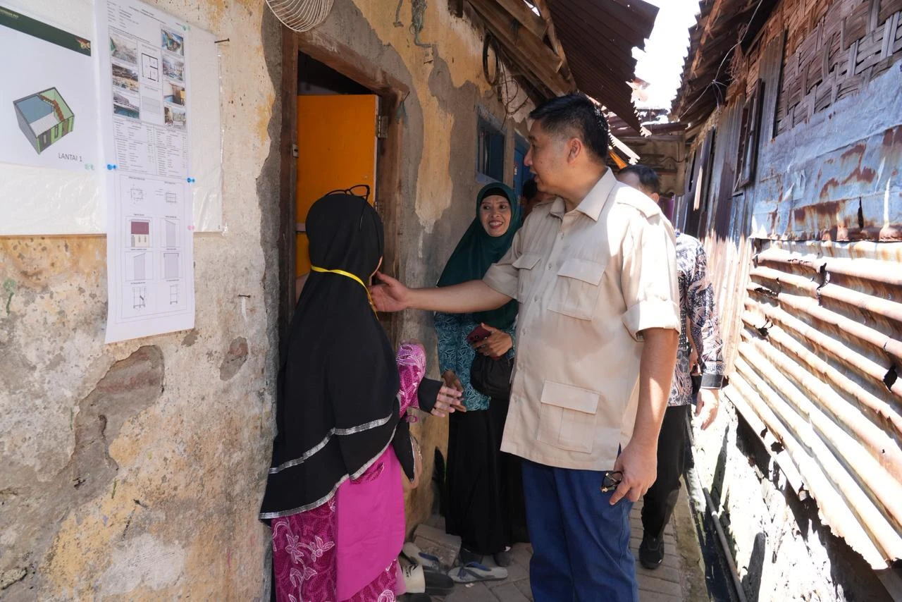 Surabaya - Menteri Perumahan dan Kawasan Permukiman (PKP) Maruarar Sirait (Ara) bersama Wali Kota Surabaya Eri Cahyadi, Dirjen Perlindungan dan Jaminan Sosial Kementerian Sosial (Kemensos) Agus Zainal Arifin meninjau pelaksanaan bantuan stimulan perumahan swadaya (BSPS) di Kelurahan Mojo Kecamatan Gubeng, Kota Surabaya, Kamis (16/10/2025).