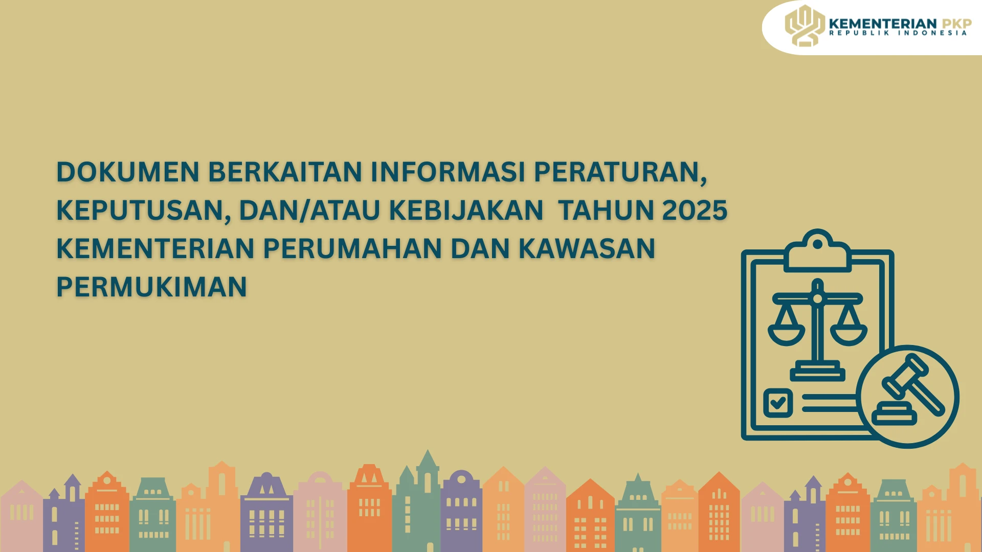 Kementerian Perumahan dan Kawasan Permukiman merupakan Kementerian yang terbentuk berdasarkan Peraturan Presiden (Perpres) Nomor 140 Tahun 2024 tentang Organisasi Kementerian Negara dan Peraturan Presiden (Perpres) Nomor 191 Tahun 2024 tentang Kementerian Perumahan dan Kawasan Permukiman, dimana pada periode kabinet pemerintahan sebelumnya pelaksanaan perumahan dan kawasan permukiman merupakan bagian Kementerian Pekerjaan Umum dan Perumahan Rakyat. Oleh karena itu, daftar dokumen mengenai peraturan, keputusan, dan/atau kebijakan yang telah diterbitkan yang dapat disampaikan hanya mencakup periode setelah terbentuknya Kementerian pada 2024.