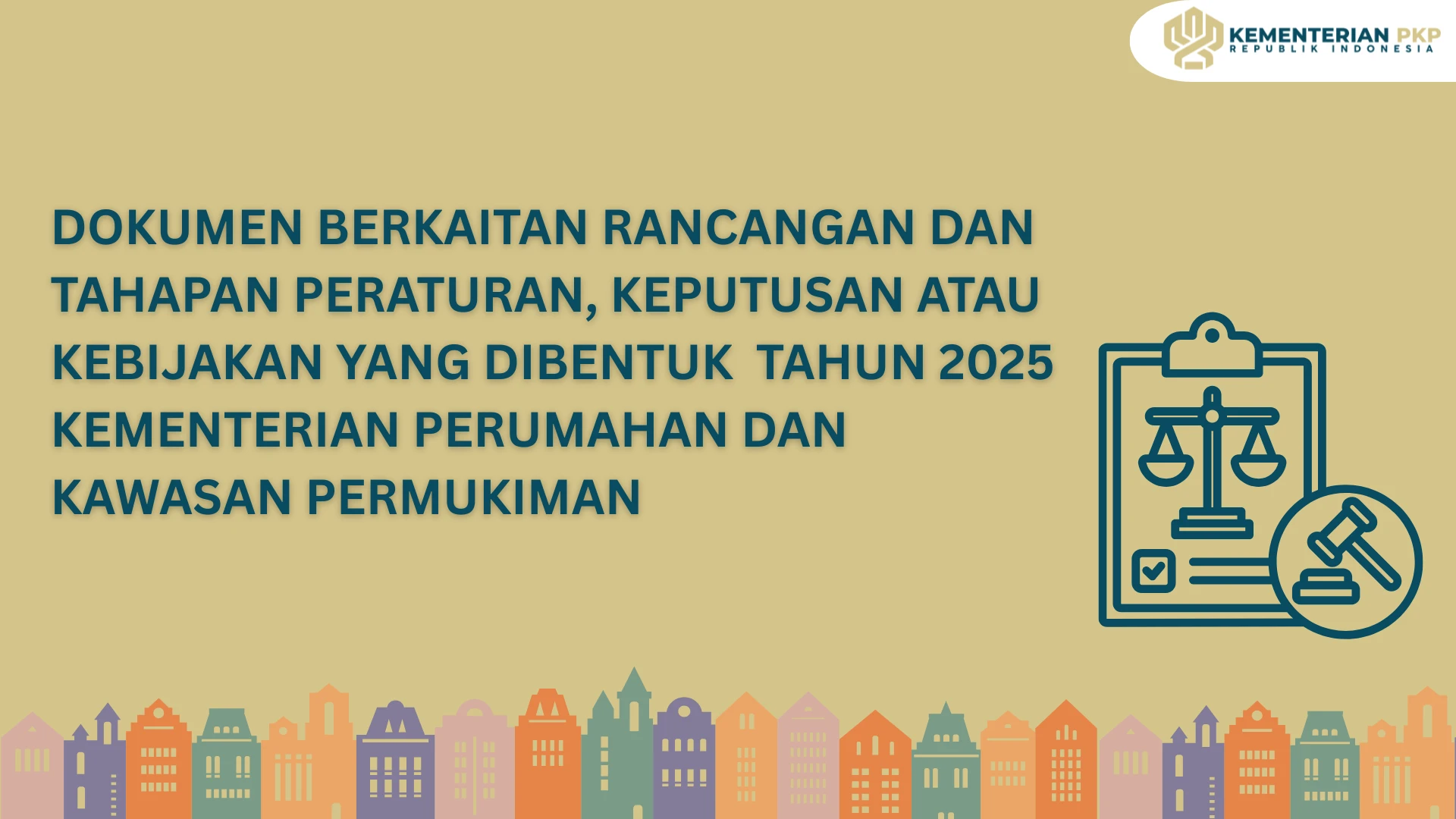 Kementerian Perumahan dan Kawasan Permukiman merupakan Kementerian yang terbentuk berdasarkan Peraturan Presiden (Perpres) Nomor 140 Tahun 2024 tentang Organisasi Kementerian Negara dan Peraturan Presiden (Perpres) Nomor 191 Tahun 2024 tentang Kementerian Perumahan dan Kawasan Permukiman, di mana pada periode kabinet pemerintahan sebelumnya pelaksanaan perumahan dan kawasan permukiman merupakan bagian Kementerian Pekerjaan Umum dan Perumahan Rakyat. Dengan demikian, daftar Dokumen Rancangan dan Tahapan Peraturan, Keputusan atau Kebijakan yang dibentuk yang dapat disampaikan hanya mencakup periode setelah terbentuknya Kementerian pada 2024.