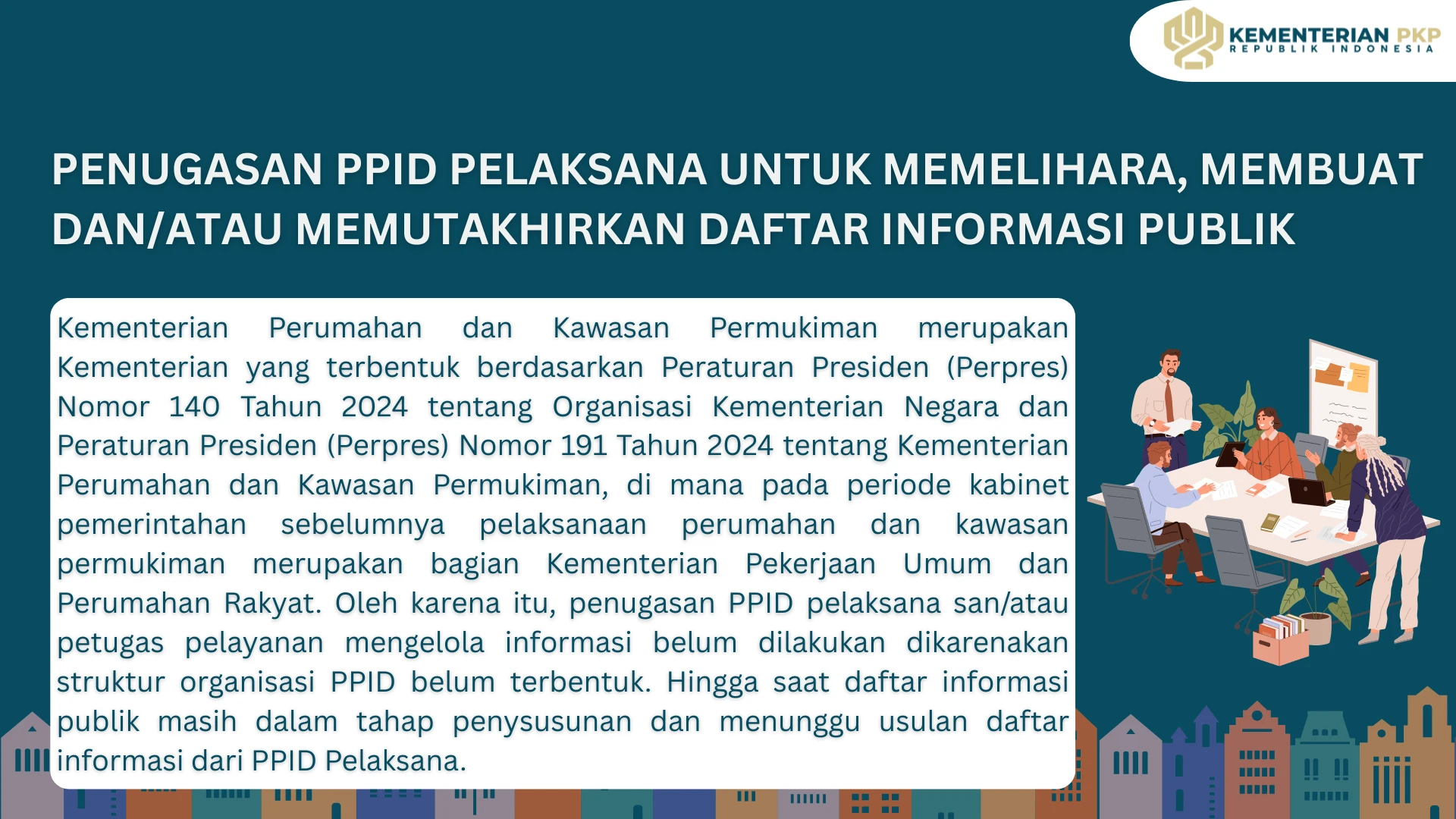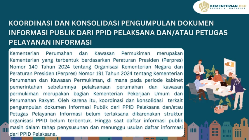 Berdasarkan hal tersebut, Kementerian Perumahan dan Kawasan Permukiman memiliki kewajiban melaksanakan penyelenggaraan PPID di lingkungan Kementerian Perumahan dan Kawasan Permukiman. Namun hingga saat ini penyelenggaraan PPID pelaksana belum terlaksana dikarenakan Kementerian Perumahan dan Kawasan Permukiman belum melakukan penunjukan tim PPID
