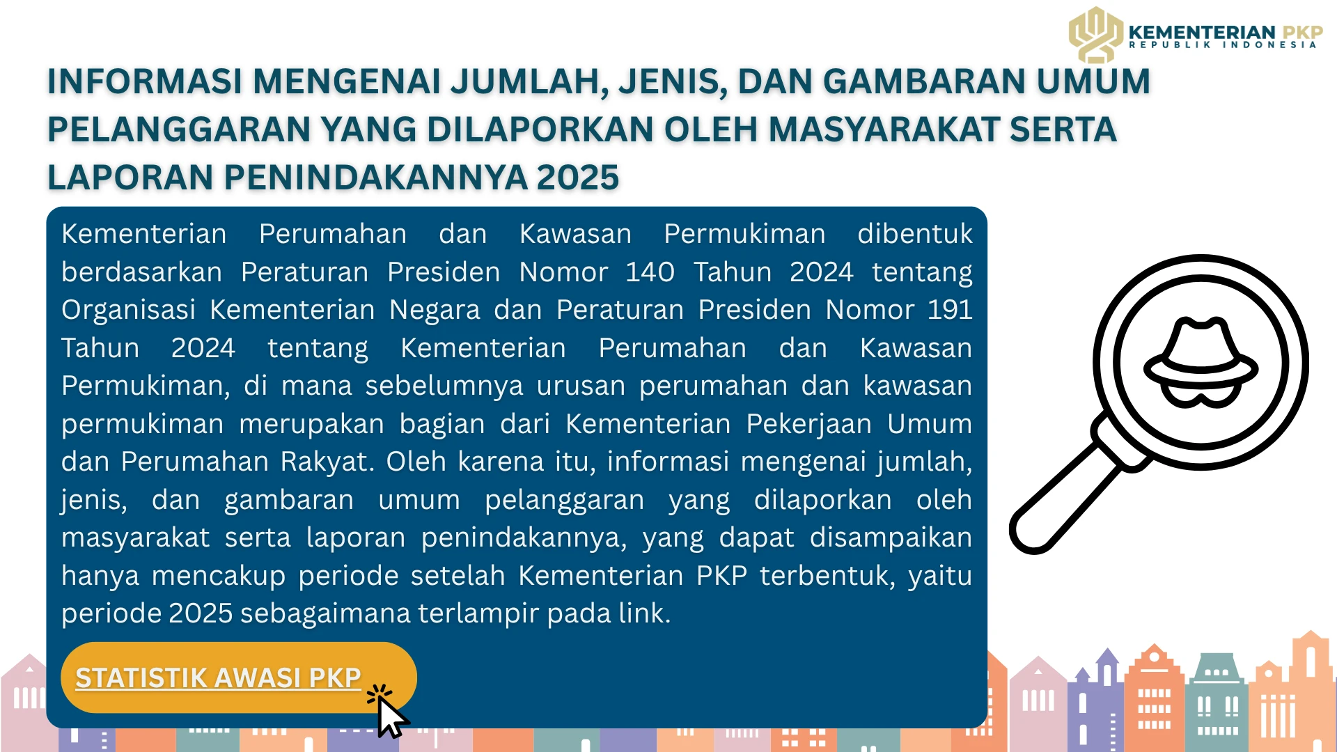 Kementerian Perumahan dan Kawasan Permukiman dibentuk berdasarkan Peraturan Presiden Nomor 140 Tahun 2024 tentang Organisasi Kementerian Negara dan Peraturan Presiden Nomor 191 Tahun 2024 tentang Kementerian Perumahan dan Kawasan Permukiman, di mana sebelumnya urusan perumahan dan kawasan permukiman merupakan bagian dari Kementerian Pekerjaan Umum dan Perumahan Rakyat. Oleh karena itu, informasi mengenai jumlah, jenis, dan gambaran umum pelanggaran yang dilaporkan oleh masyarakat serta laporan penindakannya, yang dapat disampaikan hanya mencakup periode setelah Kementerian PKP terbentuk, yaitu periode 2025 sebagaimana terlampir.